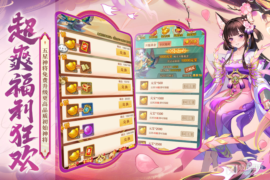 同时商店限时上线,可在对应副本商店兑换悟空执事变身卡、赤金法宝礼盒三、赤金星君礼盒三、赤金神符宝箱一、赤金神兽宝箱三、初级紫宝石箱1-6、紫金神器图纸选择箱、紫金神翼合成卡、紫金翼精华、1级金色符石8选1箱资源等商品,稀有奖励等你来拿。