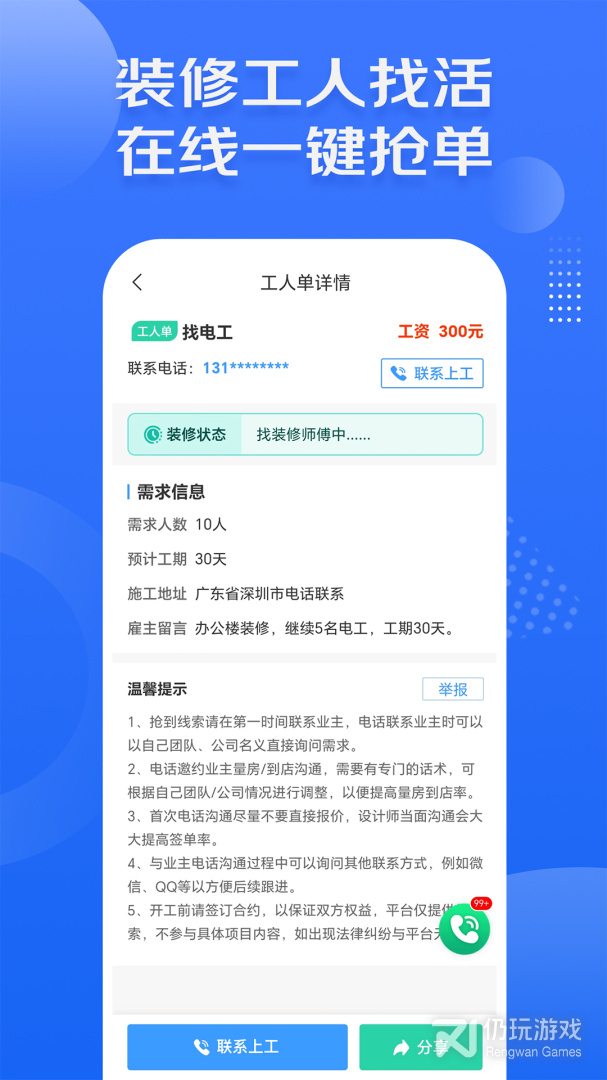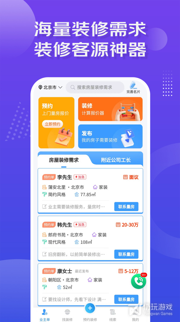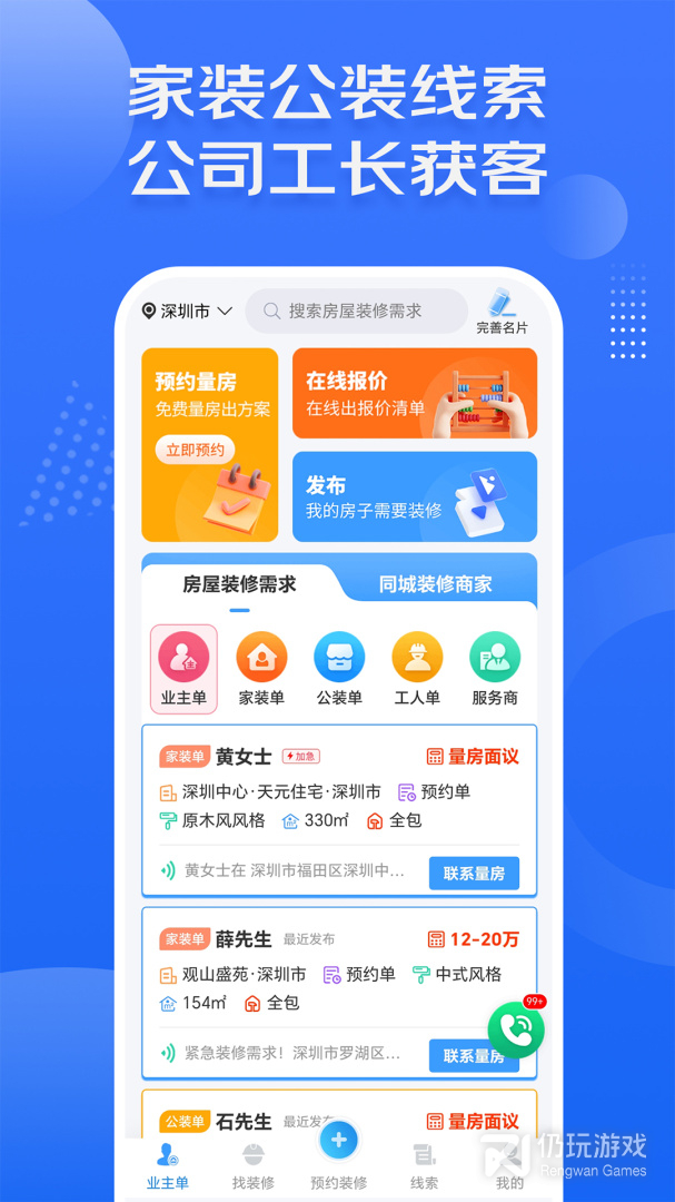2、该软件提供了海量的订单,用户能够在这里随时进行接单,然后进行上门服务,非常的方便,以及业主也可以在软件上发布订单,然后为业主进行筛选匹配专业装修人员,给用户带来了良好的装修服务
