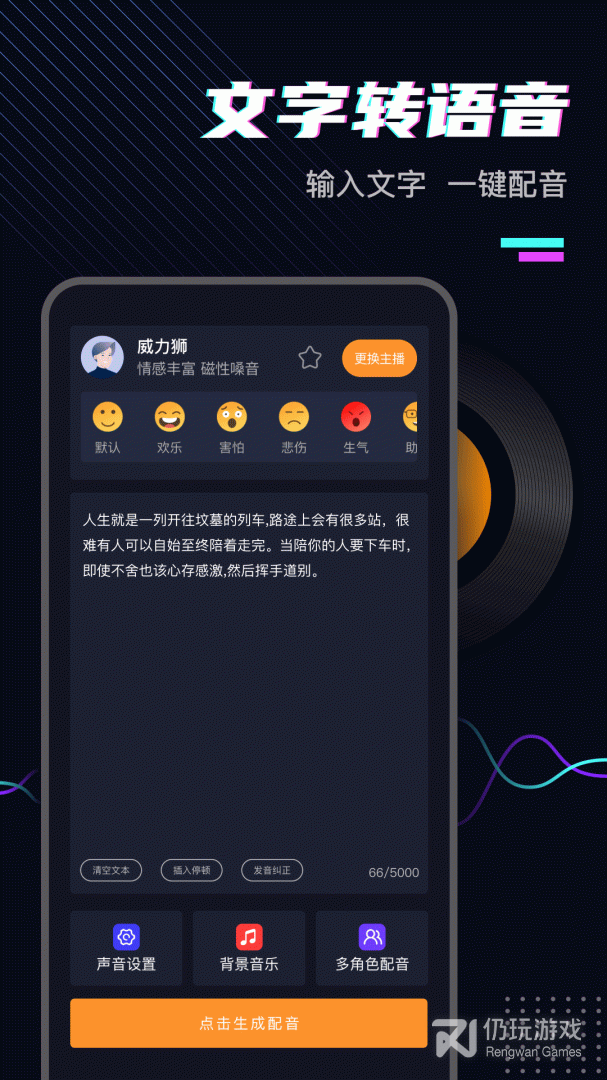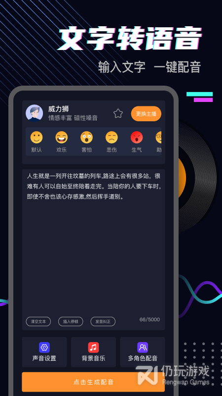1、斗帝配音是一个专门为配音爱好者而打造的手机文字转化语音工具。在这里,用户可以直接通过本软件进行文字转化,软件内置多种语音音色,拥有众多合成语音选择,完全满足用户的配音需求,是用户必不可少的配音神器