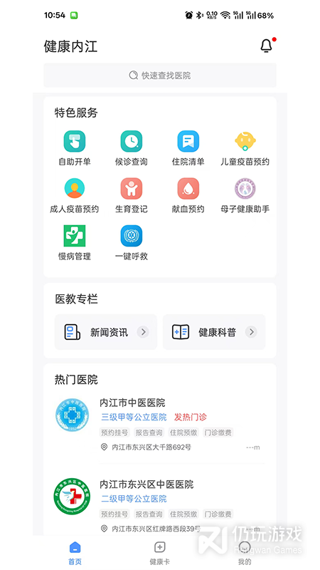 2、健康内江让本地市民看病更方便,线上就能预约挂号,支持手机缴费和办理住院,还为大家带来各种健康资讯和知识,享受优质医疗服务,关注自己的健康