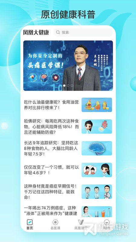 1、该软件可以让用户们每天都关注一些十分有效的养生方法,以及身体健康的知识科普,还是十分有用的,最新的医疗新闻资讯也可以了解,欢迎下载凤凰大健康体验