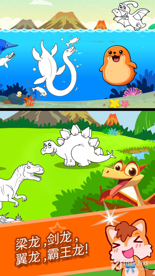 2、在这里汇集了多种恐龙类型,可以随时进行恐龙素材选择,进行不同的颜色选择涂色,操作方法简单,帮助孩子提升色彩搭配能力,即可使用哦