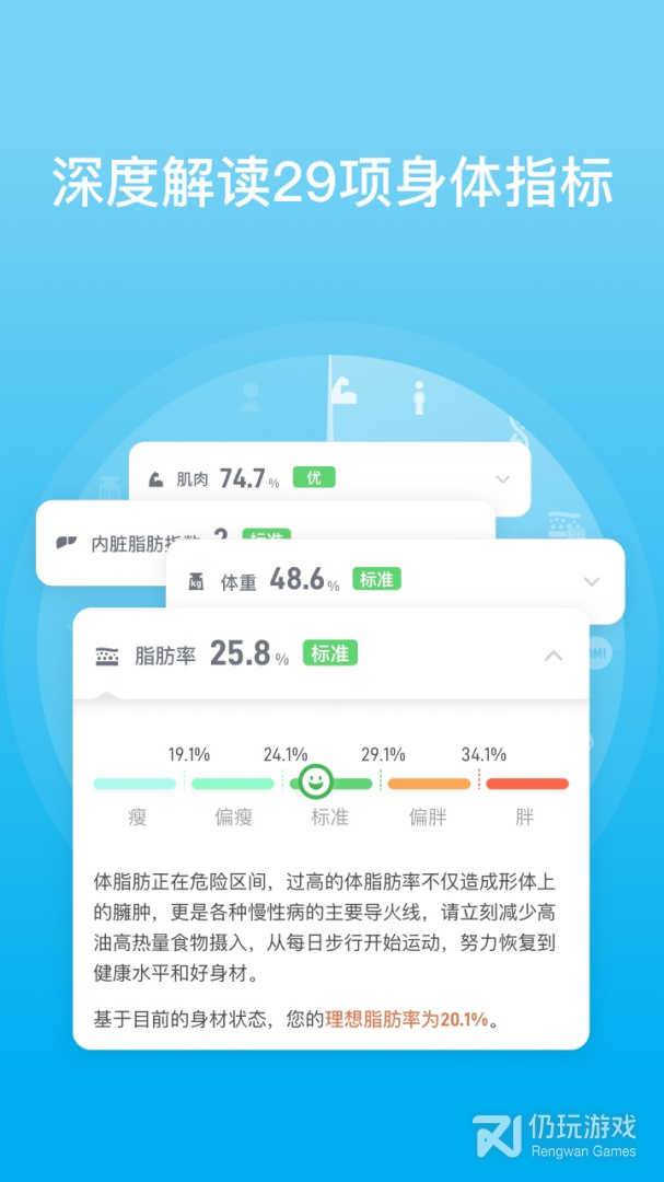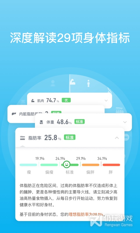 *最强大的身体数据分析软件:基于体围、体重数据进行腰臀比和身型状态分析,也可以配合有品智能体脂秤,全面监测体脂率、内脏脂肪指数等29项身体指标,直观了解最关心的身体数据,每个细微变化都一目了然;