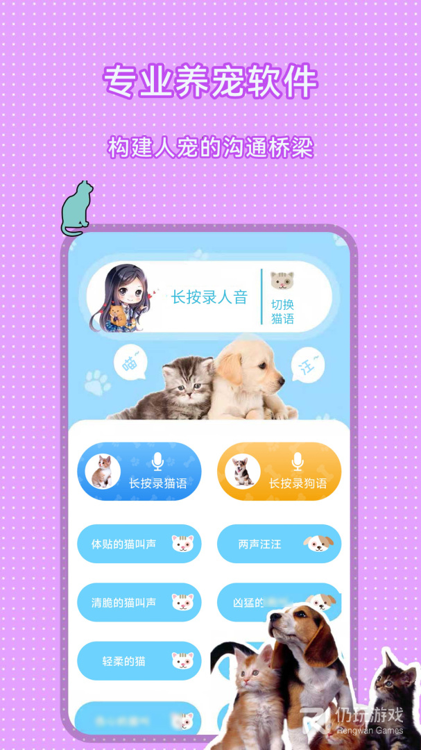 人猫人狗翻译交流器是一款非常有趣的宠物语言翻译器,其中包含多种猫狗叫声、养猫养狗常识、宠物百科知识...有趣的功能当属宠物语言翻译器功能了,您可以使用该功能随机录下一段语音,转化成猫语狗语播放出去,和家里的宠物进行交流互动哦~