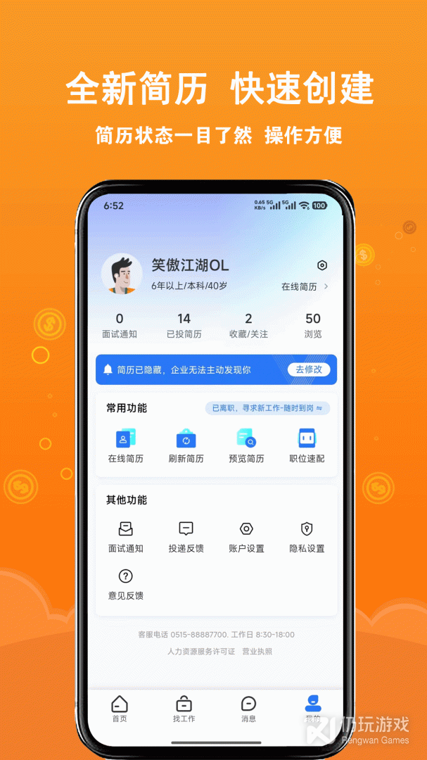 2、快速创建在线简历,简历状态一目了然,操作方便,并提供了简历完善度;