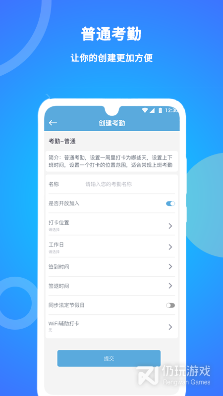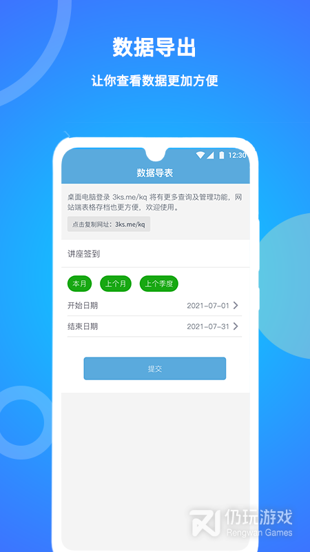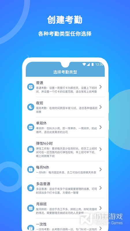 1、随时都可以在线满足你的考勤需求,不同类别记录还会不一样,我们还有配合使用的电脑网页端,还可以方便管理者的统计、导出和备份工作