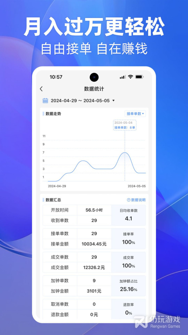 1、用户可以在线自由接单,工作时间完全自由,多劳多得,可在线对订单进行管理,每一笔收入都清澈见底,还可以查询每天、每周以及每个月的详细收入数据,高薪收入,轻松赚钱