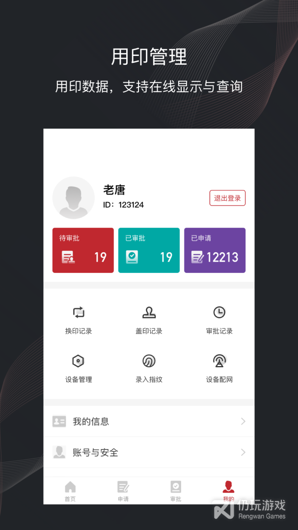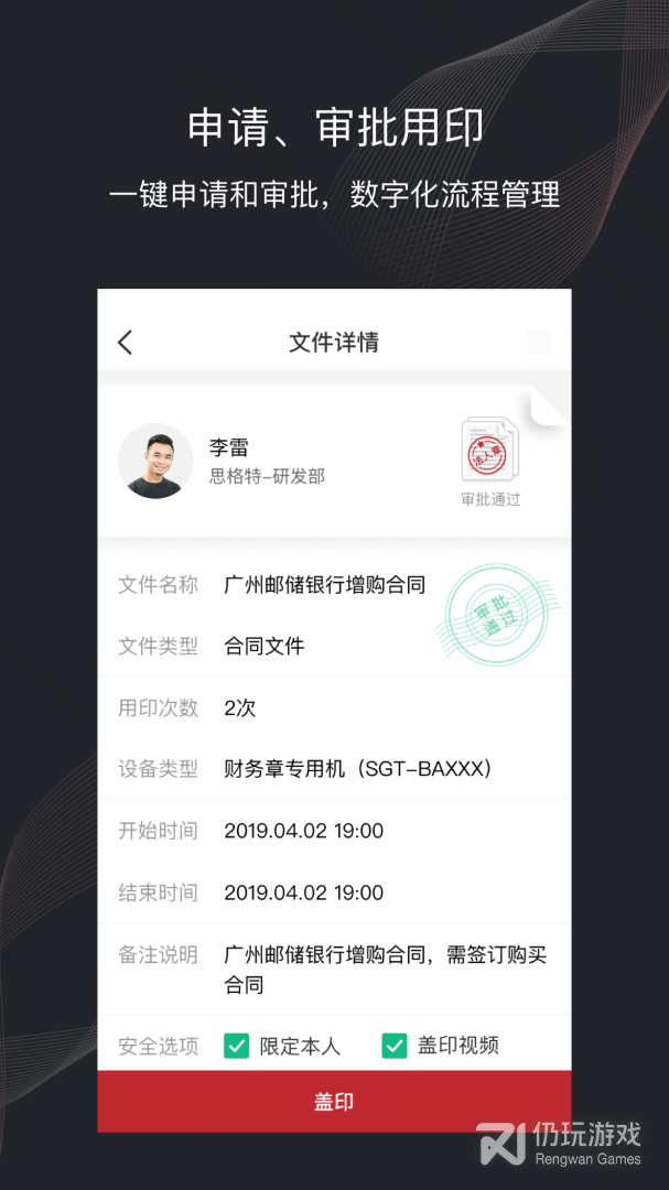 2、应用中有申请用印功能,用户能够一键提交用印申请,快速用印;