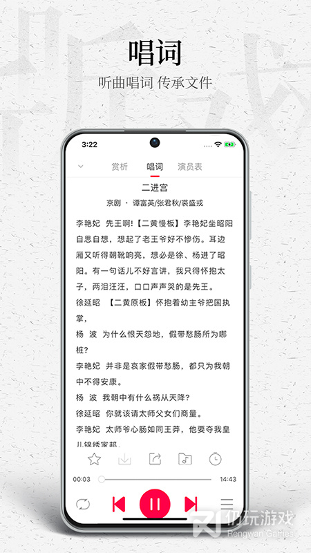 4、点开听戏界面之后可以看到简单的播放界面,有滚动唱词,有相关简介