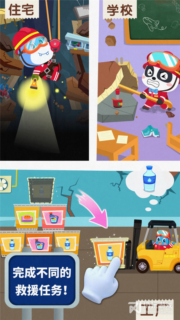 1、宝宝地震安全3游戏中拥有救援准备、救援任务,通过宝宝地震安全3这款游戏可以帮助小孩子在游戏中学习地震安全知识