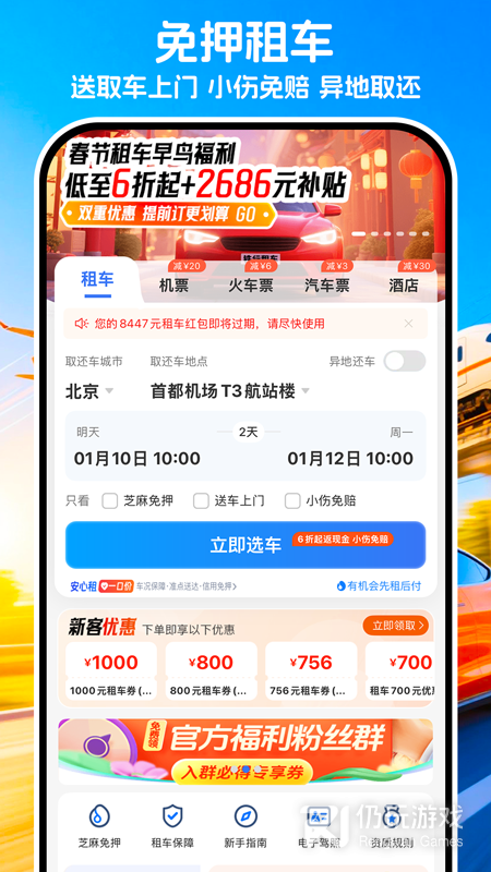 新人专享800元租车券 春节出行租车6折起另送2686元特惠券礼包 还可享随机返现金