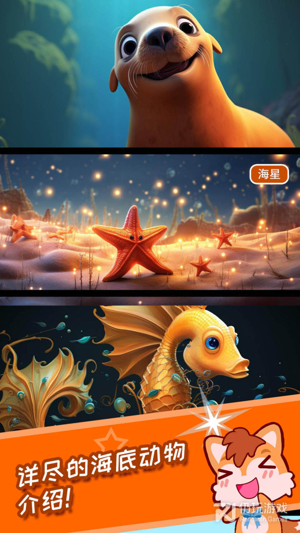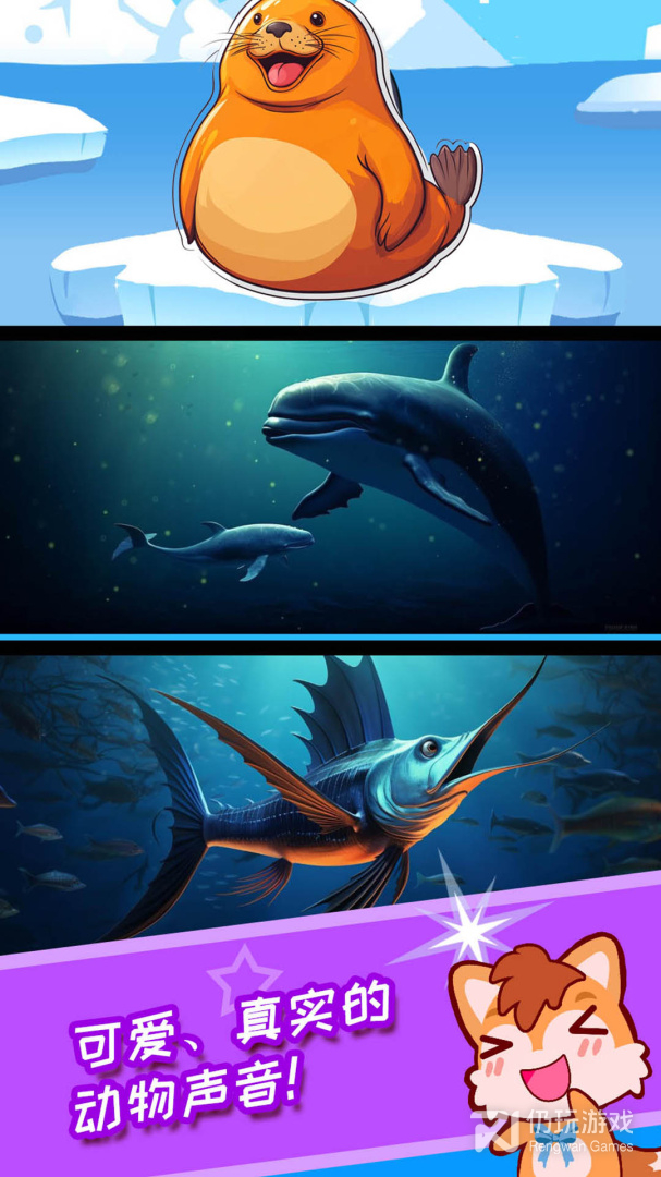 1、每一种动物都有详细的介绍,供用户进行一一的认知,每种海洋生物都能收听叫声,通过视听感官轻松认知各种动物,还有动听的音乐伴随孩子游戏,让孩子在轻松的氛围学习海洋动物知识