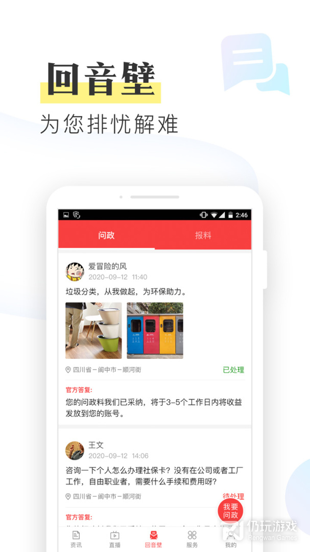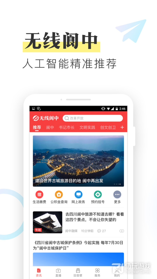 1、旨在为阆中用户提供新闻资讯、视频直播、政务服务、便民服务等诸多内容