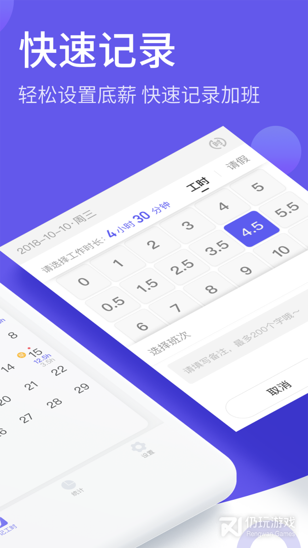 1、快速记工时:设置好底薪和月工作小时数,就可以自动帮您计算工时收入;
