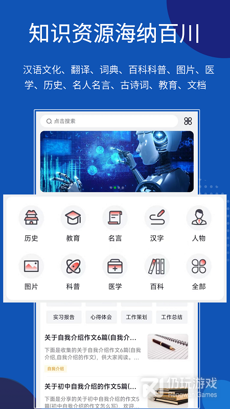 通过机器学习自然语言处理对海量知识资源进行智能搜索,对汉语知识、双语翻译、知识百科、名人名言、医学健康、科普技术等实现知识挖掘、知识分类、知识融会、知识搜索等功能。
