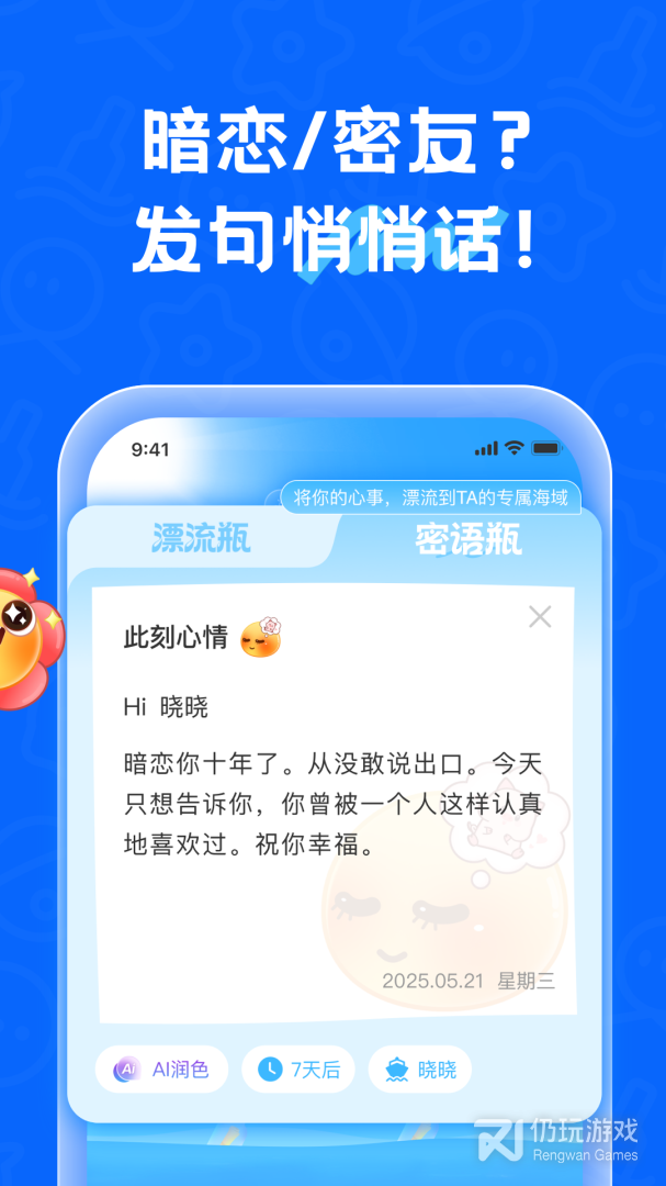 2、遇见漂流瓶清爽版是陌生人匿名社交软件,也许你的下一份缘分就在这里!遇见漂流瓶清爽版让你和好友有更多的互动机会,这里保护用户隐私。在遇见漂流瓶清爽版里,你可以讲述不能说的秘密,在这里,你可以尽情释放你的另一面!陌生人交友社区,让你无忧无虑,尽情讲述你的秘密