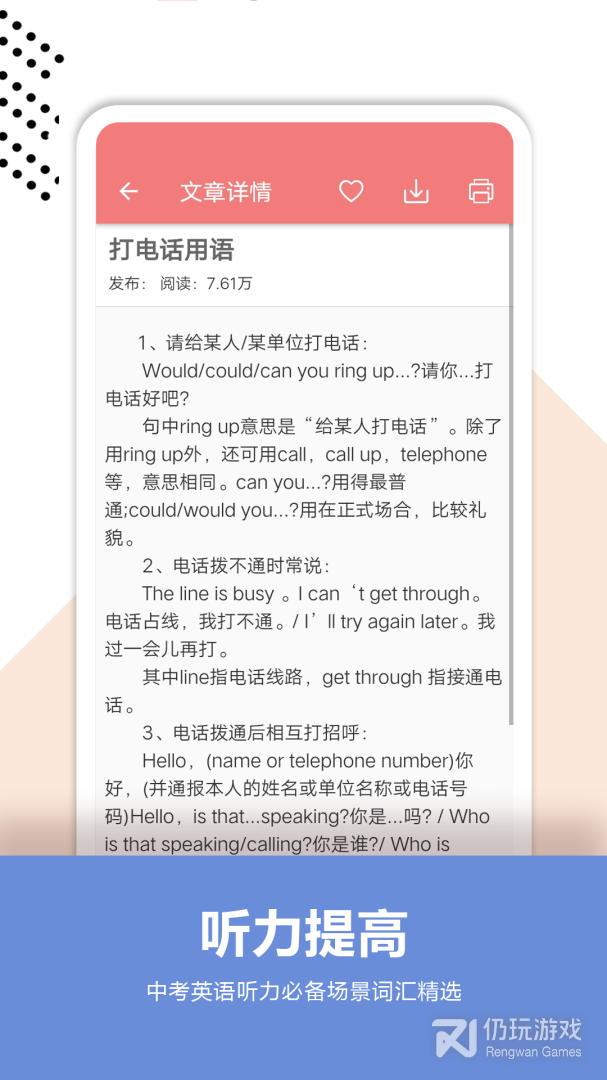 1、是专门为中学生打造的学习英语类APP,学生们可以在这里随时随地进行学习英语,中考英语通拥有中考英语科目所有知识点,帮助同学们顺利提高英语成绩,是一款非常实用的学习英语软件,感兴趣的同学可以到下载实用哦