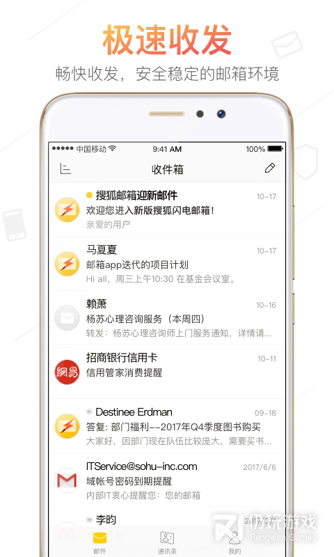 3、搜狐邮箱是由搜狐推出的接收邮件的软件。本软件可以为用户提供安全、稳定的邮箱环境,告别垃圾邮件和病毒邮件,并且能够为用户实时同步邮箱通讯录,方便用户使用邮箱。