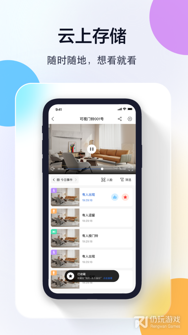 看店看家:随时查看家里、商铺、办公室等场所的实时视频、云端录像。