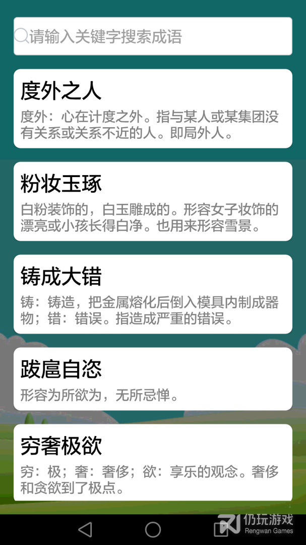 3、介绍成语的起源,介绍成语所代表的意义,通过做游戏的方式,让同学们增强对成语学习的兴趣,并且该软件还支持成语词典,有不懂的成语都可以查,想要更快更好的学习好成语,就赶紧来下载吧