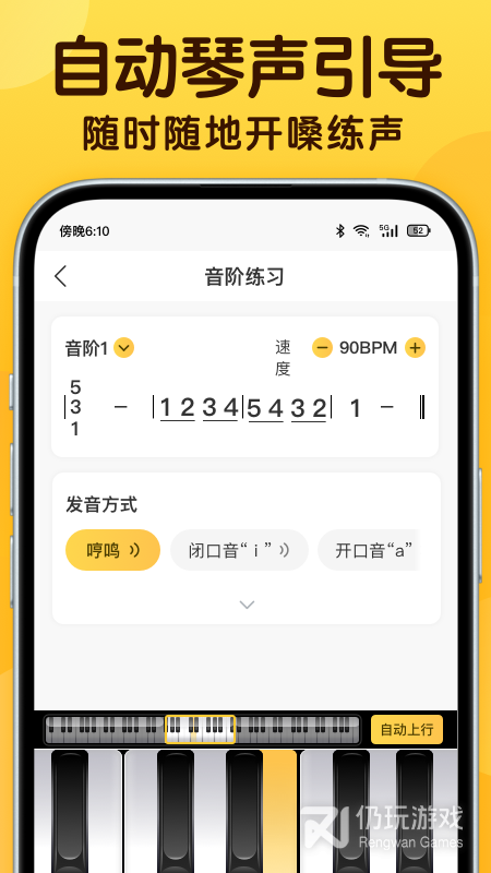 1、使用方法简单,一键播放练声旋律,可以选择不同常用型播放,还可以设置播放速度,拥有钢琴伴奏,还有标准琴声引导,轻松掌握音准,让开嗓更加方便,需要伙伴,即可安装使用哦