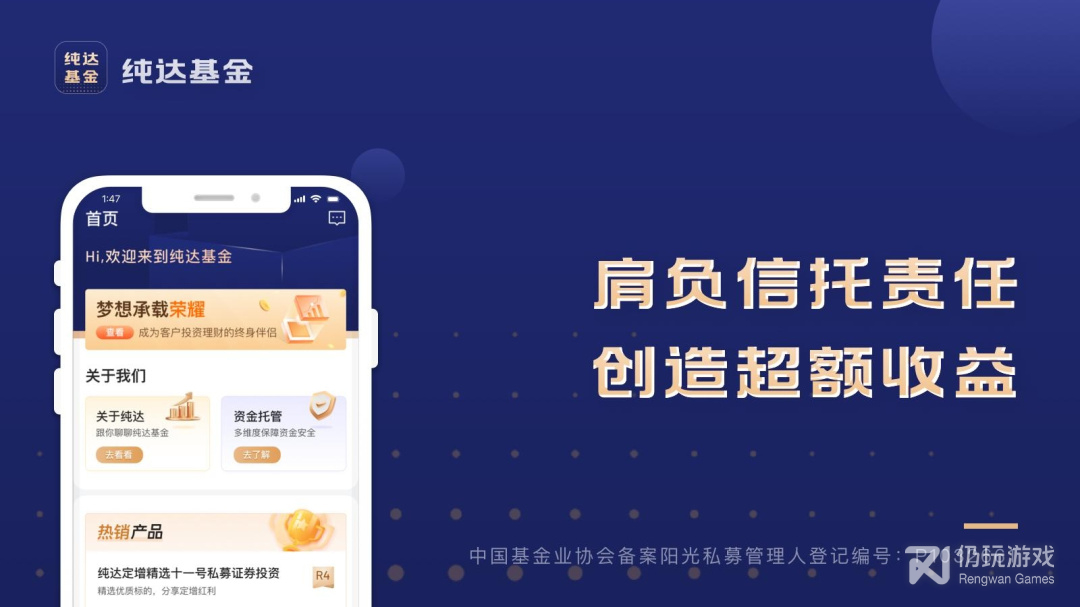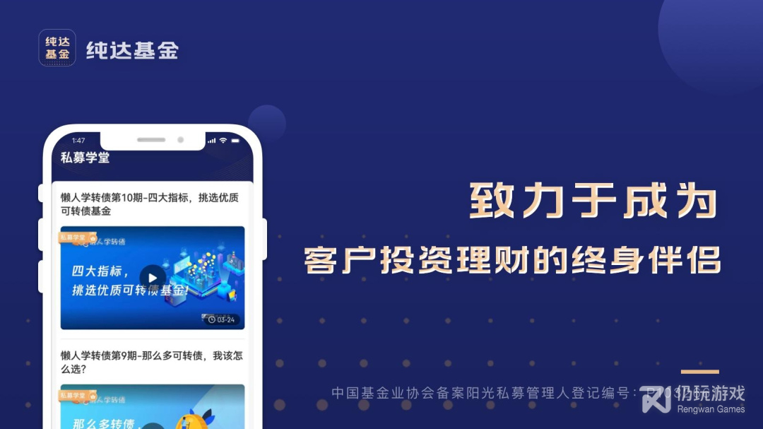 1、纯达基金用专业的团队,高端的资产管理方式和强大的攻速实力,为你提供最为安全可靠的资金托管,资产投资和资产升值服务,让你轻松理财,放心理财,各种课程内容也能让你走进基金金融市场,了解行情!点击下载纯达基金就能轻松实现啦