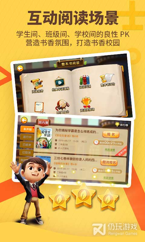 功能整合,优化用户体验!升级后原一级主界面的:阅读任务、考试、竞赛场、诗词院、成语之王、朗读家等功能模块整合到了【互动厅】;公告通知、荣誉榜、阅读记录、奖赏兑换、背包、设置等功能模块整合到了【我的小屋】;