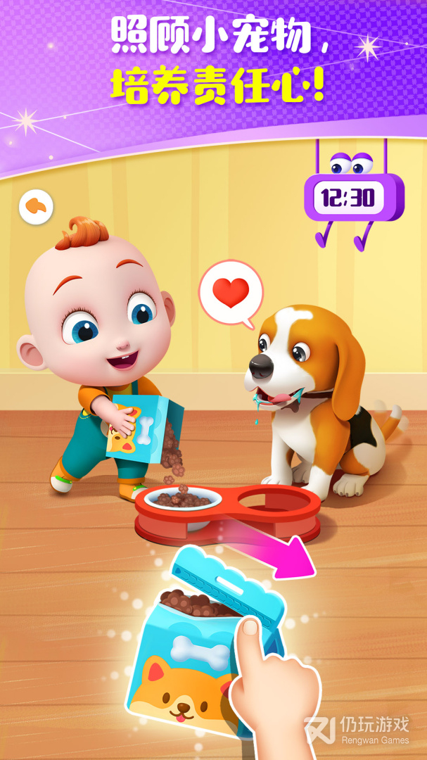 是谁在汪汪叫?是小狗Bingo!它的肚子快饿瘪了,需要进行喂食,宝宝赶紧来帮帮忙:撕开狗粮袋,倒满宠物餐盆。Bingo好像没吃饱?使用开罐器,再为它开一个宠物罐头吧。