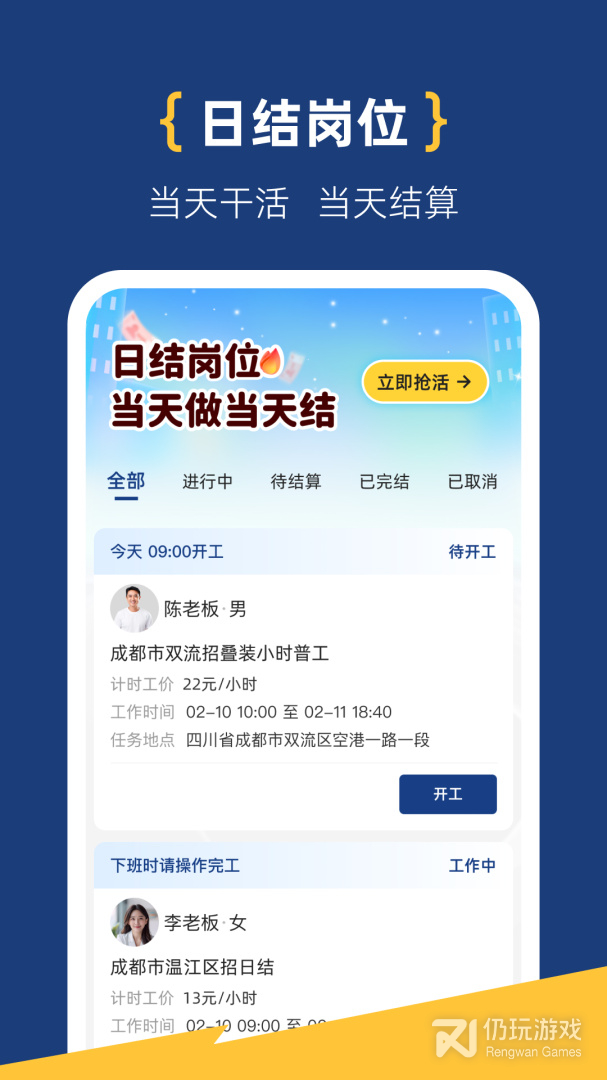面咖是为同城的工友,蓝领提供的招聘app。也提供零工的服务,方便大家找附近的工作机会。可以看到招工的信息,可以筛选职位,薪资,是一个工厂招工,各类的服务,建筑,装修、服务领域招聘的软件,还能线上聊工作,扩宽人脉。服务极佳,求职便利,可以一站式的使用的线上软件。