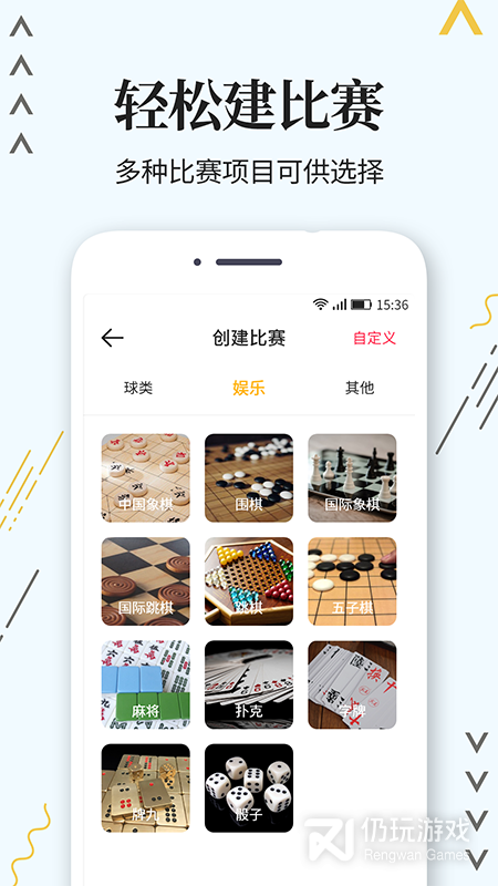 1,创建比赛-选择一种比赛类型,点击后,进入房间等待界面,选择加号邀请好友参赛,设置单人或组队模式,如果没有您要的比赛分类,可以使用自定义功能创建比赛名称。