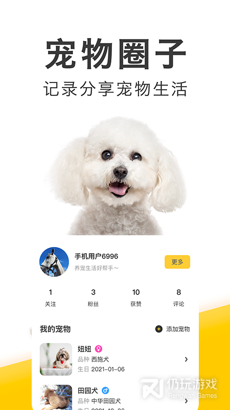 有只宠物社区平台,包括狗狗猫咪领养,狗狗猫咪相亲,狗狗猫咪寻配种借配种,狗狗猫咪成长记录,宠物喂养咨询问答,宠物在线交易,宠友交流社区,分享记录宠物日常生活。