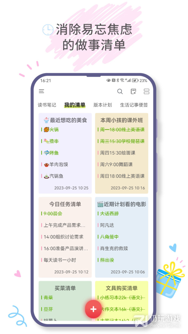 - 创建电影、读书、购物、采购、育儿、工作计划、学习计划、待办事项等清单,轻松安排日常生活
