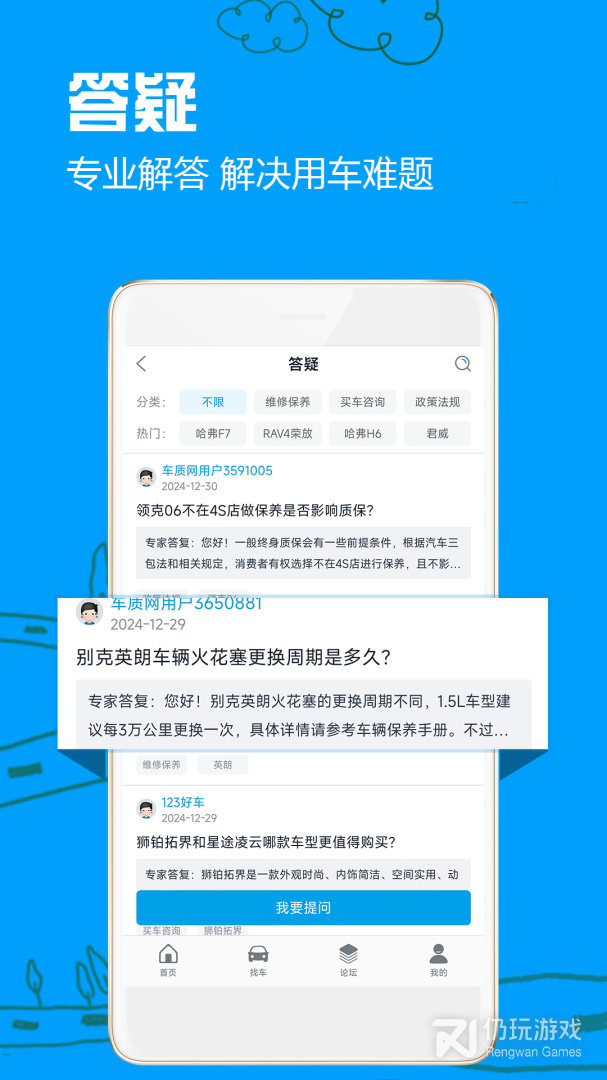 4、划分了不同的答疑专区,有维修保养、买车咨询、政策法规等不同栏