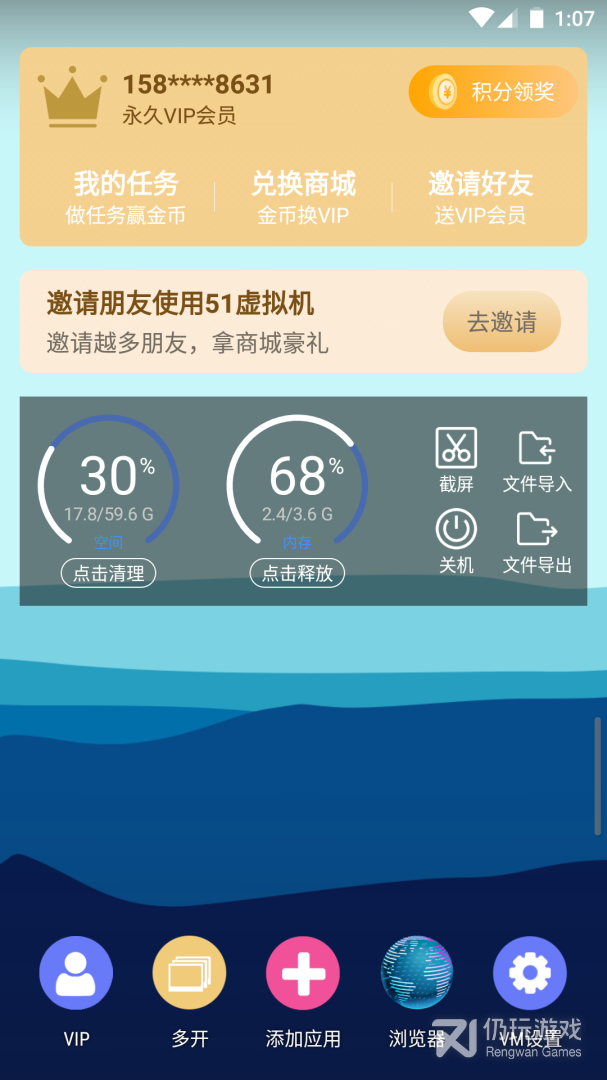 51虚拟机,手机移动设备上的安卓虚拟系统,又称Android Virtual Machine(简称VM,即虚拟机,PC上类似的软件有VMWare、VirtualBox),51虚拟机软件实现手机双系统/多系统同时运行,相当于一部手机分身成两部手机甚至更多使用!51虚拟系统内运行的游戏、应用即使退到后台,51虚拟机也可以继续小窗口分屏运行,并且51虚拟机软件支持锁屏托管自动升级!