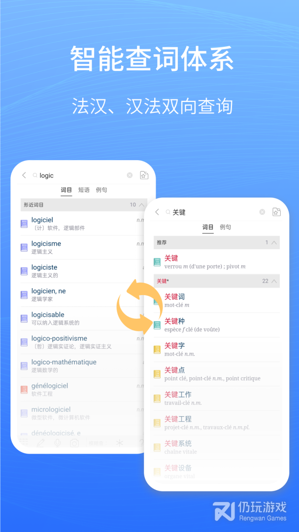 集《新世纪法汉大词典》、《汉法大词典》、《法汉工程词典》、《汉法工程词典》、《国际商务法语词典》、《汉法英体育词典》6部词典的海量词条于一体,外研社法语大词典App提供法汉、汉法双向查词服务,融入智能联想技术,一站式查遍法语词目、短语、例句。
