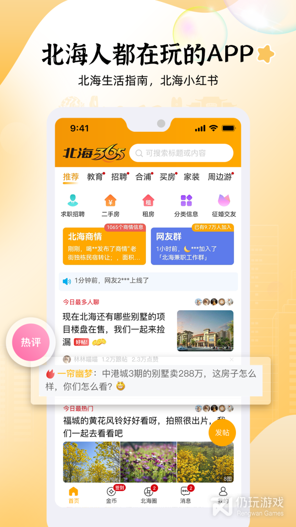 1、北海的小伙伴看过来,小编今天为大家带来这款提供北海各种生活信息的软件北海365,在这里大家可以找到北海最好吃的美食,最便利的活动,随时可以在线聊天交流,和大家一起分享生活趣事,热点新闻,还可以在软件中享受各种生活服务,无论是找工作找房子还是找朋友,都可以在软件中轻松寻找