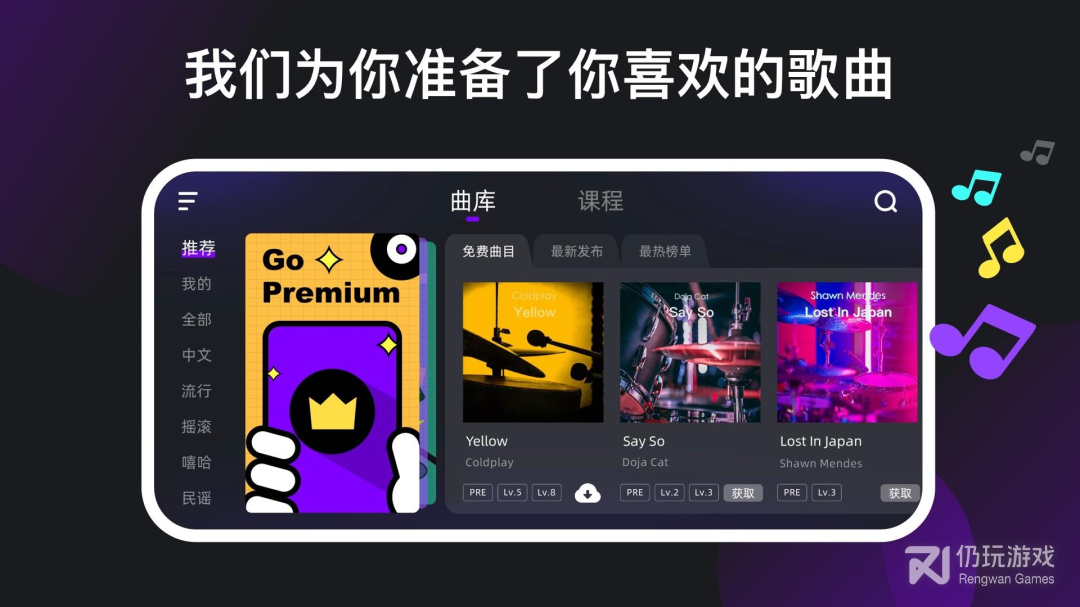 1、包含课程和曲库两大版块,覆盖各种曲风和不同难度