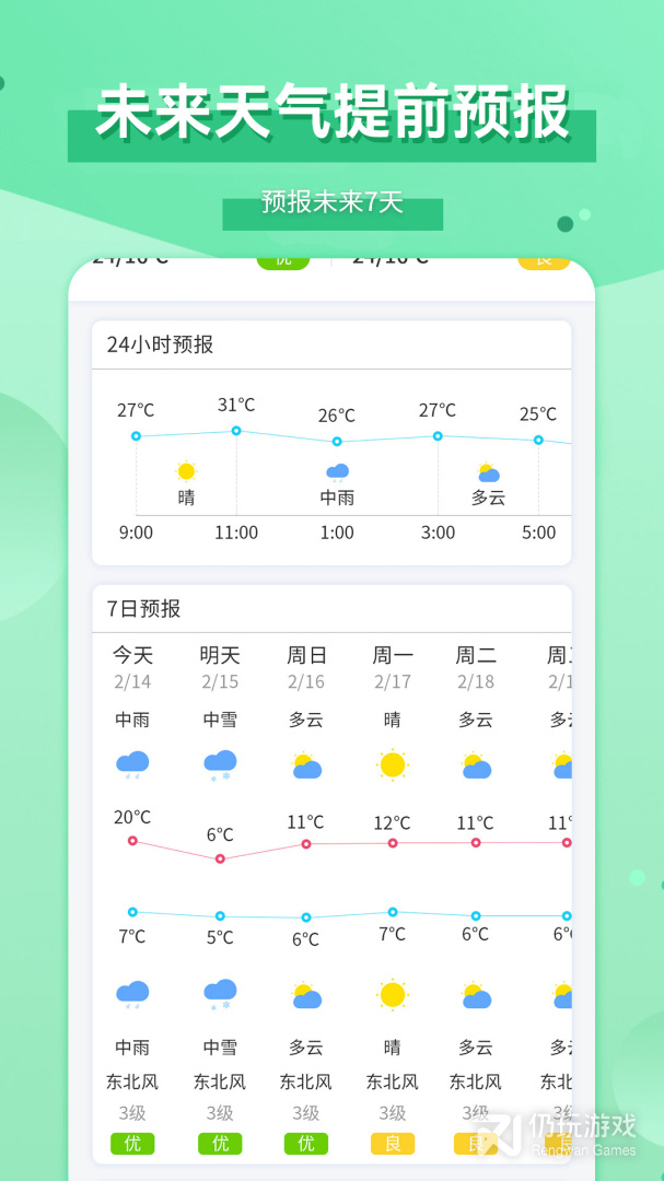 1、这款软件上面用户可以随时的进行天气情况的查看,能够让大家及时的查看出行的准备