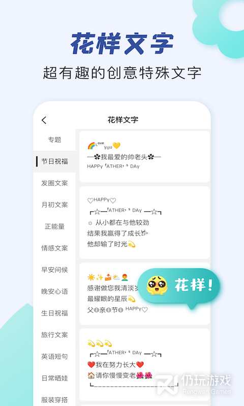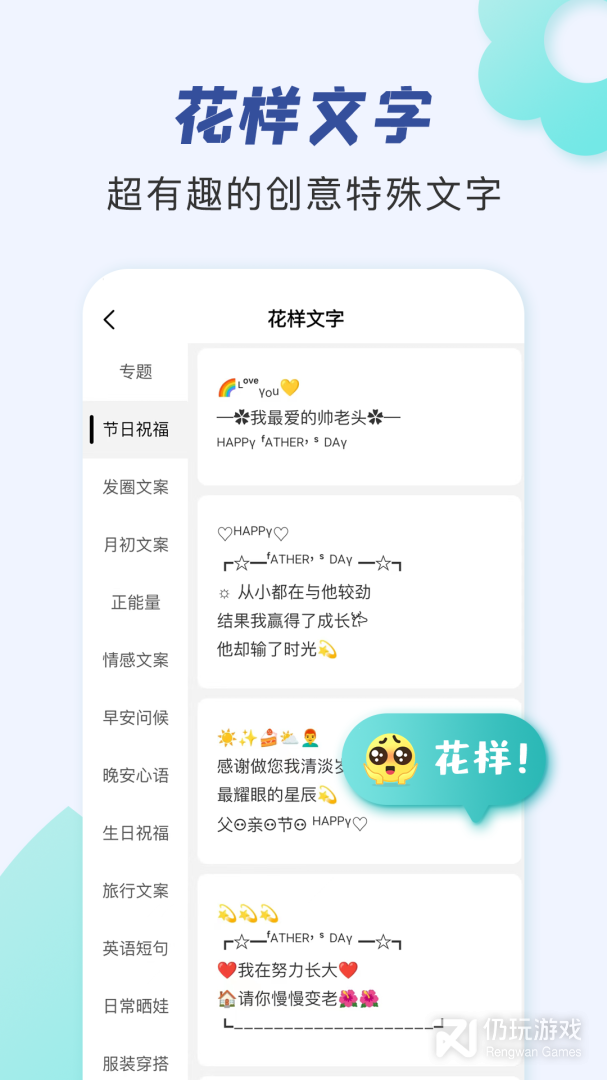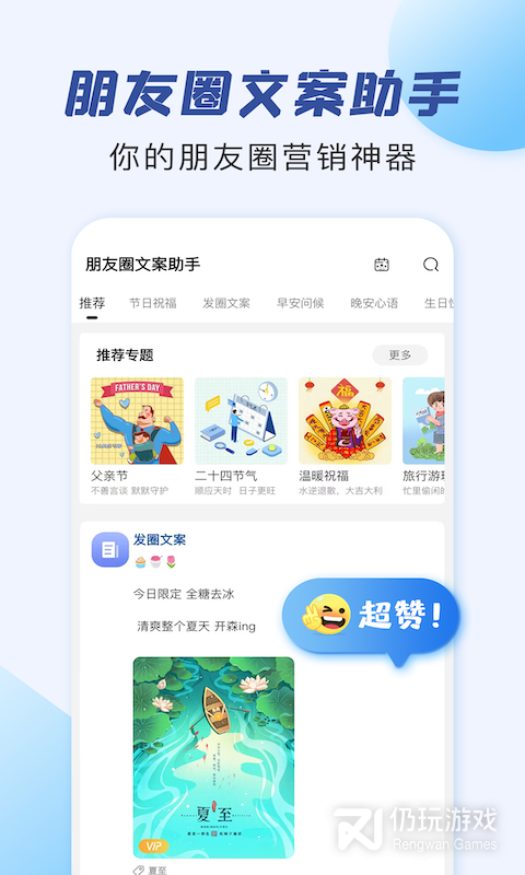 3、朋友圈文案助手为你带来了更为优质的文案服务平台,让你可以轻松拥有非常精美的文案内容,大家可以更为愉快的进行使用,让你的社交内容更加的有魅力,可以吸引大家的注意