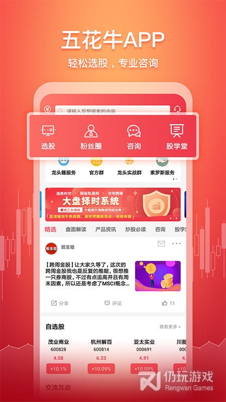 1、五花牛股票,AI诊股,大数据智能分析,一键诊断个股短中长操作策略;大盘择时,市场情绪判大盘,抓机会,避风险;大师金股,早盘推出,大师精选短线牛股;涨跌三线,一眼辨多空,红涨绿跌三线定买卖