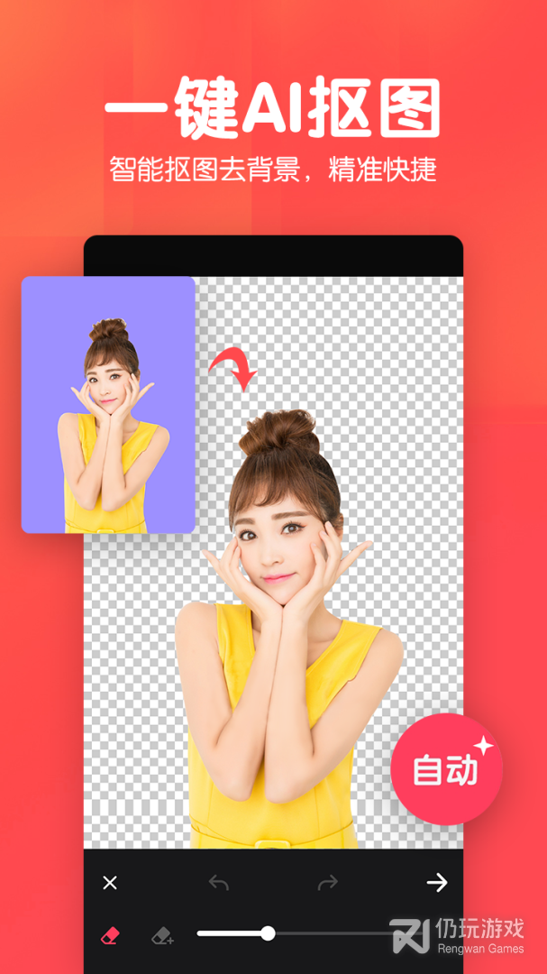 App支持自动抠图,一键式智能地为用户删除不必要的背景图片,使抠图更加方便快捷,腾出双手,简化了操作步骤,并节省了更多的编辑时间。 它还支持免费去除水印的功能,例如剪裁图片,更改背景,编辑图片,拼图和贴纸等。