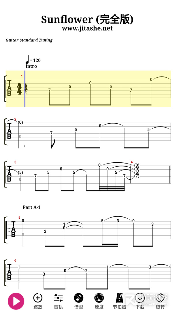 2、竖屏可以看文本吉他谱,横屏看六线谱,提供了自动滚动翻页功能