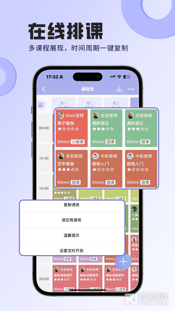 打开团课课程表,在线可以调整瑜伽老师的课程安排