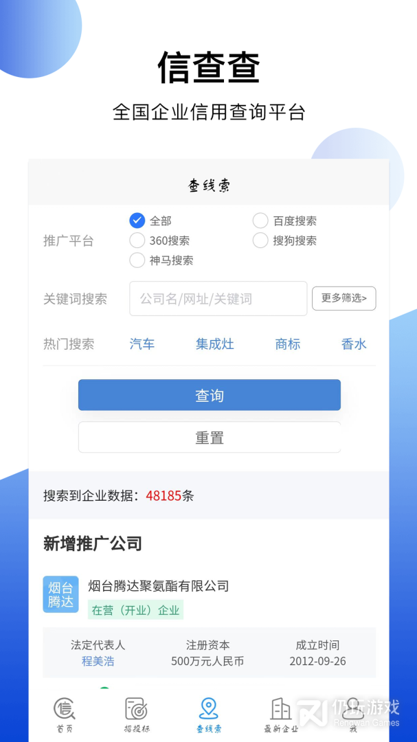 2、信查查xcc,一站式招投标服务,查招标、查拟建、查中标、信查查一键可查;最新注册企业信息查询,海量最新注册企业信息,专项专查,助力挖掘更多新客户