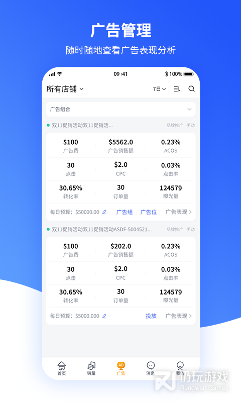 5、广告管理,随时随地查看广告表现分析,还可以进行广告调价