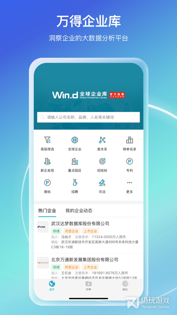 3、万得企业库app,是一款综合性的手机移动办公服务平台,能够为企业提供多种帮助,这里涉及了工商,司法,经营,新闻等多种数据,让你可以对不同的企业都有全面的了解。想要查公司,查任务,查关系都可以来这里,不需要用户花钱就能直接搜索,也为企业带来了便利