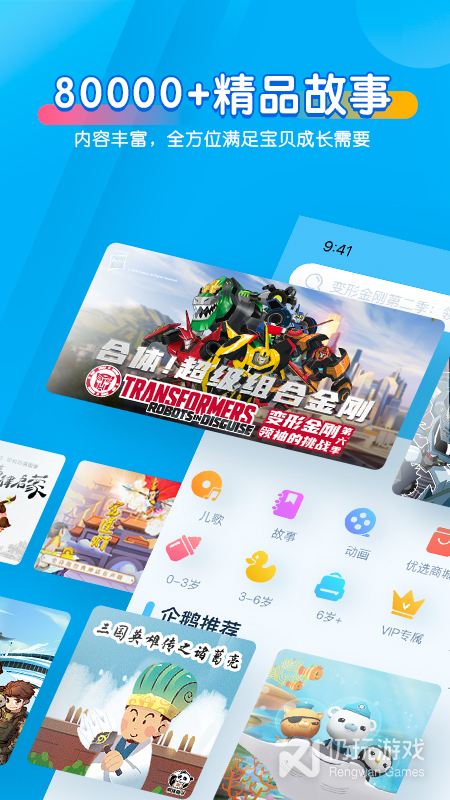 3、海量好故事,经典童话,寓言故事,当代童话,古诗,经典名著,国学启蒙,民间故事,成语故事,世界名人,历史故事,生活安全,自然知识,文化风俗,天文地理,奇趣百科,品格培养,情商培养,经典故事,奇幻冒险,少儿军事,魔法科幻,校园故事,动物故事,侦探推理