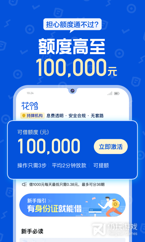 当您用自己手机下载花鸭借钱App后,进入借款入口,点击立即激活额度→填写资料→获得额度。