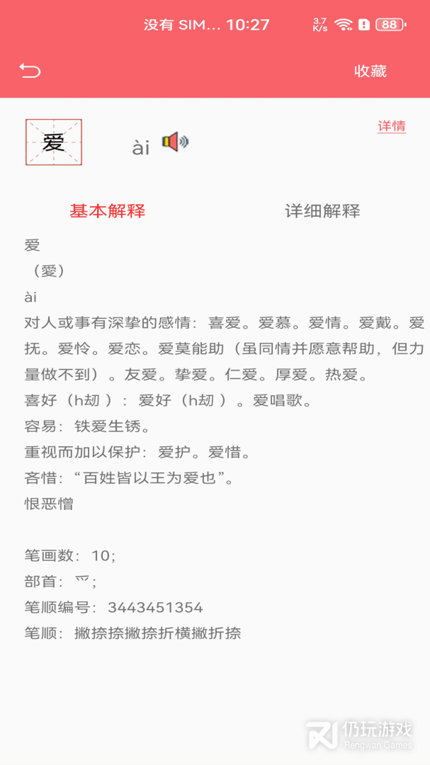 3、平台可以在这里查读音、查字义,甚至连笔画数都有哦,检索方式也是有很多中的,如部首、拼音等等,每一种方式都是很简单的,而且用户遇到有需要的还可以进行收藏,对了,查阅的历史也可以实时查看呢
