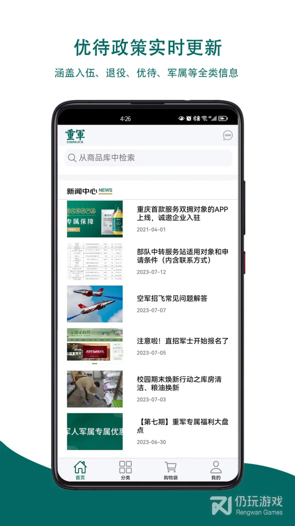 3、重庆军供app给退役退军人提供的军粮供应服务平台,部队的采购单位可以轻松的予以取暖供应平台进行相连接,在平台内就可以进行下单订购,前面的保障所有粮油物资的使用,平台会第一时间提供高质量高标准的物资,一些退役军人还可以得到福利
